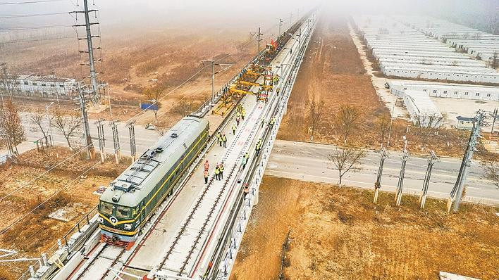 本报讯(记者周亚彬通讯员侯晓静董策)12月19日上午,在京港高铁雄商段邢台清河县铺轨施工现场,最后一对500米长钢轨的铺设就位,标志着该段正线铺轨完成,这为线路按期开通运营奠定了坚实基础。