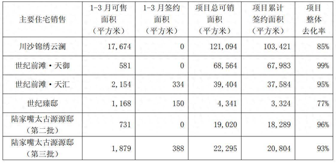 在房地产销售方面,报告显示公司在1-3月期间的可售面积和签约面积相对较低,主要项目的整体去化率保持在较高水平。